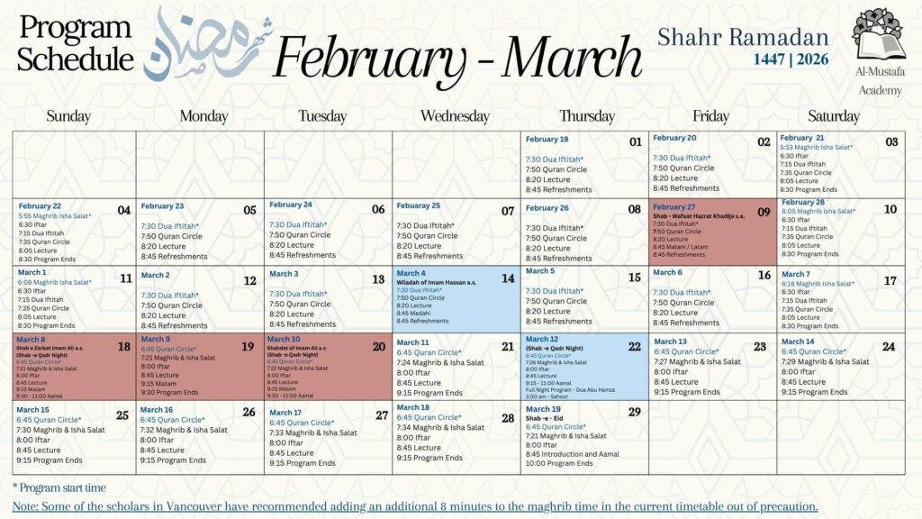 Join Al-Mustafa this year’s Ramadhan Program. Our Ramadan program runs throughout the blessed month with engaging nightly gatherings for all ages. Weekday programs begin in the evening with Dua Iftitah, a Quran circle, a short lecture, and light refreshments, while weekend programs include congregational Maghrib and Isha prayers followed by iftar and our regular spiritual program. Beginning March 9, we will host daily sessions starting at 6:45 PM, including special a‘mal on the nights of Laylatul Qadr. We welcome the community to join us for all 30 days as we learn, worship, and grow together.